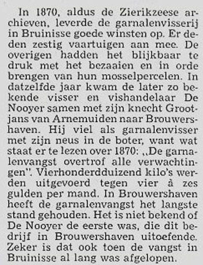 De Nooijer bracht vaak verse vis naar de schepen op de rede van Brouwershaven in ruil voor spek enz. Door kontact met de kapiteins kreeg hij adressen van Engelsen die zijn garnalen op de markt van Londen en Grimsby wilden verkopen. Enkele vissers volgden zijn voorbeeld en gingen ook regelmatig op garnalen vissen, o.a. Boelhouwer van Beveren met zijn zoons Maarten en Kees (Cornelis).