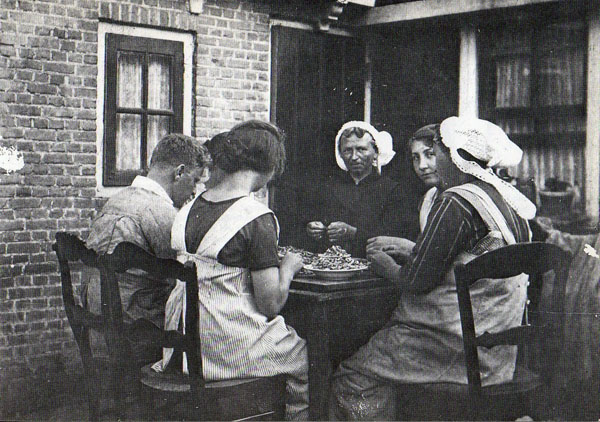 Toen de vraag groter werd liet men de mensen thuis garnalen pellen.