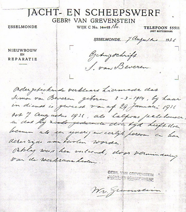 Daarna werkte Simon als halfwas jachtbouwer bij jacht- en scheepswerf gebroeders Grevenstein in Ijsselmonde. Hij kreeg ontslag omdat er gebrek aan werk was. Hij vertelde dat veel rederijschepen waren opgelegd en dat schepen van particulieren door de geldschieters werden verkocht. Later vertelde hij dat hij graag timmerman had willen worden. Hij heeft ook staaltjes vakwerk op dit gebied laten zien. Wie weet of deze voorliefde voor hout geboren is in de kuiperij van zijn opa.