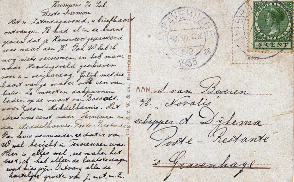 In 1933 stuurde C de Nooyer een briefkaartje aan Willem, a/b van m.s. Broedertrouw.